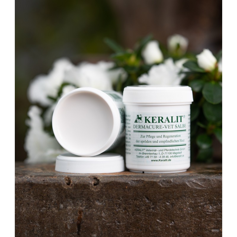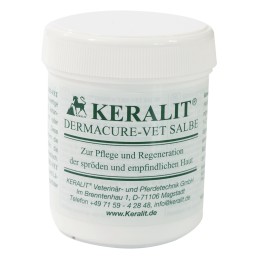 Bei Mauke und Ekzemen sind die betroffenen Hautbereiche oftmals spröde und gereizt. KERALIT Dermacure Salbe beinhaltet hochwertige, pflegende Substanzen wie z.B. Dexpanthenol, Johanniskrautöl und Zinkoxid. Diese unterstützen die Regeneration der irritierten Hautbezirke. Pflegesubstanzen halten die Haut geschmeidig, elastisch und verhindern somit ein erneutes rissig werden. Die KERALIT Dermacure Salbe ist zur Nachbehandlung eine sinnvolle Ergänzung zur KERALIT Keralysin-Salbe.