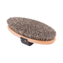 Cerdas dispuestas sumamente densas y compuestas de una mezcla de primera calidad (50% crines de caballo/50% fibras sintéticas). La bruza ofrece excelentes resultados en la limpieza con, al mismo tiempo, un efecto extraordinario y agradable de masaje. No sólo se elimina a fondo la suciedad en un abrir y cerrar de ojos, sino que también se obtiene un pelaje súper brillante. Serie de bruzas Exclusive Line by Waldhausen - No sólo los materiales utilizados de alta calidad, como son las crines de caballo, el pelo de coco y las crines de cabra dispuestos en el dorso de madera de haya, sino también una calidad de primera categoría y duradera constituyen las características principales de esta colección de bruzas. La correa de cuero de alta calidad se fija a mano con clavos. Fabricado en Alemania Medidas: Dorso: 19 cm, cerdas: 2 cm