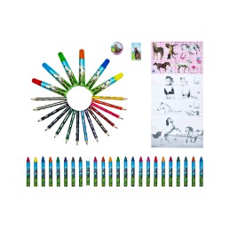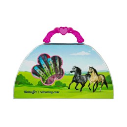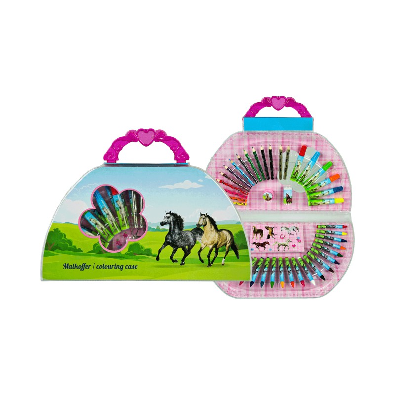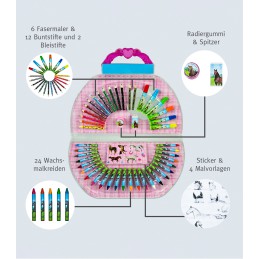 Horses wherever you look. The practical semi-circular plastic art case with carrying handle in pink. Contents: 12 coloured pencils, 6 fibre tips, 24 crayons, 1 eraser, 1 sharpener, 2 pencils, 4 templates and 1 sticker sheet. From 3+ years.