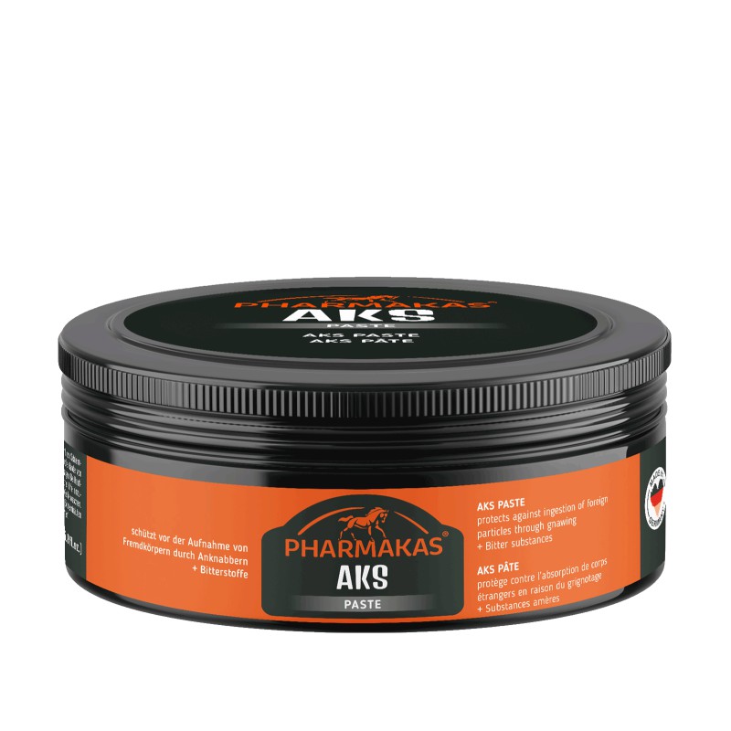 Pharmakas® AKS Paste contains bitter substances and so effectively protects horses against the ingestion of foreign bodies, thus preventing serious injuries or illnesses (e.g. colic). In addition, AKS provides support in combating crib-biting (cribbing or windsucking). The bitter substance used does not present a health risk to humans and horses and, yet at the same time, is effective in preventing unwanted chewing. It has a long-lasting effect. Repeated application increases effectiveness. Application: Pharmakas® AKS Paste can be applied to all common items and surfaces: ideal for ropes, rugs, girth, bandages, stall walls, doors and cribs. Please check the product‘s compatibility on an inconspicuous place prior to use. Wear gloves when applying the product. Pharmakas® AKS Paste is not applied directly onto the horse! Contains capsicum! if unintended contact with horse occurs: pay attention to ADMR compliance! Content: 200 ml