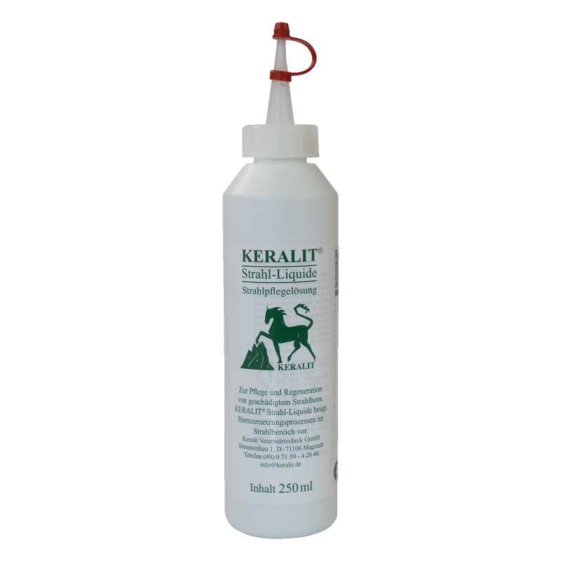 De kikkerverzorgingsoplossing is ideaal voor de verzorging en preventie van achteruitgang van de kikker. Het hoorn wordt onverteerbaar voor bederf veroorzakende bacteriën en schimmels, alleen dan kan er weer nieuw, gezond hoorn aangroeien. KERALIT Frog Liquid is een vloeibare, goed hechtende oplossing, speciaal voor de probleemzones van de kikker. Het wordt gebruikt voor de verzorging en regeneratie van beschadigde en versleten zachte hoorn. De kikkerverzorgingsoplossing is vooral nuttig voor reeds verzachte, stinkende centrale en zijgroeven. Schadelijke effecten van stalstrooisel zoals ammoniak en waterstofsulfide worden direct geneutraliseerd! Na 3-4 dagen gebruik drogen de groeven van de kikker zichtbaar uit. De kikker kan zo gezond teruggroeien. Toepassing: Maak de kikker vóór de behandeling droog met een wattenstaafje en spatel. De kikker mag niet worden uitgespoeld of zelfs met zeep worden gewassen. Zeep is alkalisch en bevordert de verspreiding van schadelijke schimmels en bacteriën. Na een grondige reiniging wordt de vloeistof met de sproeikop diep in de groeven van de kikker aangebracht, zodat ook de spruw diep in de groeven kan worden behandeld. Er kan ook een in KERALIT Kikkervloeistof gedrenkt wattenstaafje worden geplaatst. Vaste pluggen van het wattenstaafje moet worden vermeden.