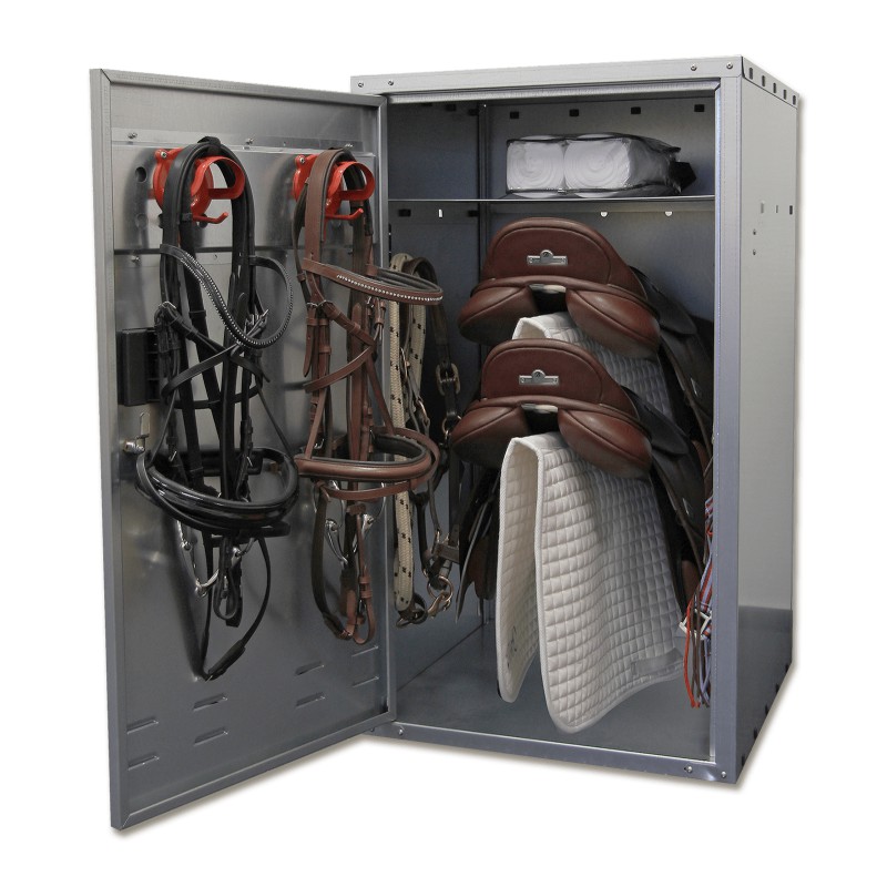 Zadelkluisje voor zelfmontage. Eenvoudig te bouwen met instructies, geschikt verpakt voor transport. Kan per koerier bezorgd worden. Beschikt over twee zadelrekken, twee hoofdstelhaken en haken voor kleine voorwerpen en een opbergvak.