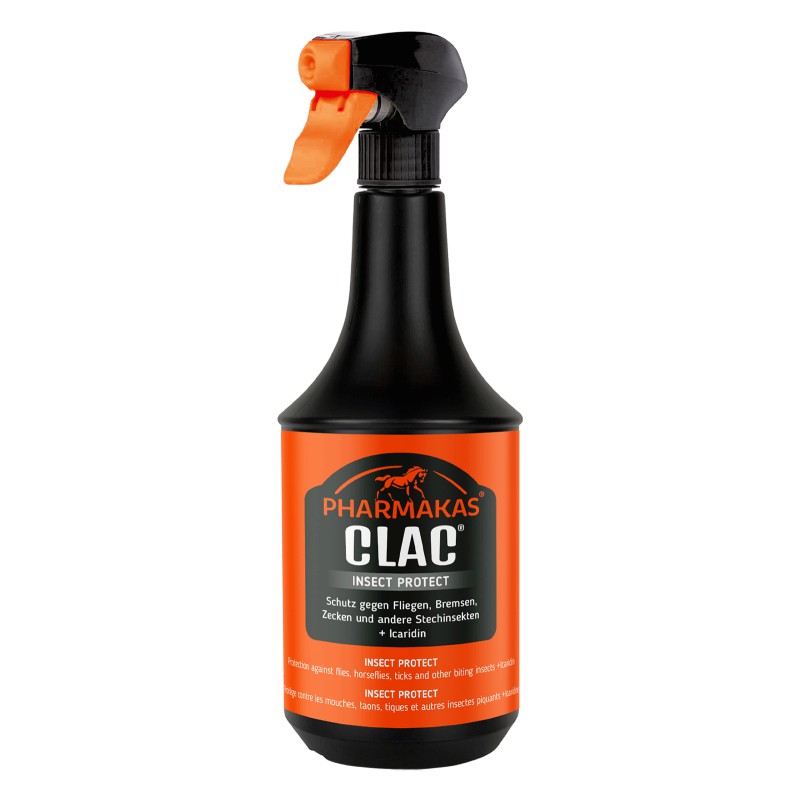 Pharmakas® CLAC Insect Protect Spray met icaridine is uw veilige en betrouwbare bescherming tegen insecten zoals vliegen, dazen en teken. Het hoge beschermingsniveau treedt onmiddellijk na het aanbrengen in werking en er ontstaat een verdediging die urenlang op hetzelfde niveau blijft - zelfs bij hevig zweten. Dankzij het speciale ingrediënt icaridine heeft deze hoogwaardige spray een bijzonder langdurige werking en is tegelijkertijd huid- en vachtvriendelijk. Onze ervaring is dat icaridine geen allergische reacties veroorzaakt en goed wordt verdragen. Daarom is de spray ook bij uitstek geschikt voor paarden met een gevoelige huid. De innovatieve spuitfles garandeert gebruiksgemak, een geruisloze applicatie met een fijne, gelijkmatige spray en de mogelijkheid tot volledig legen.