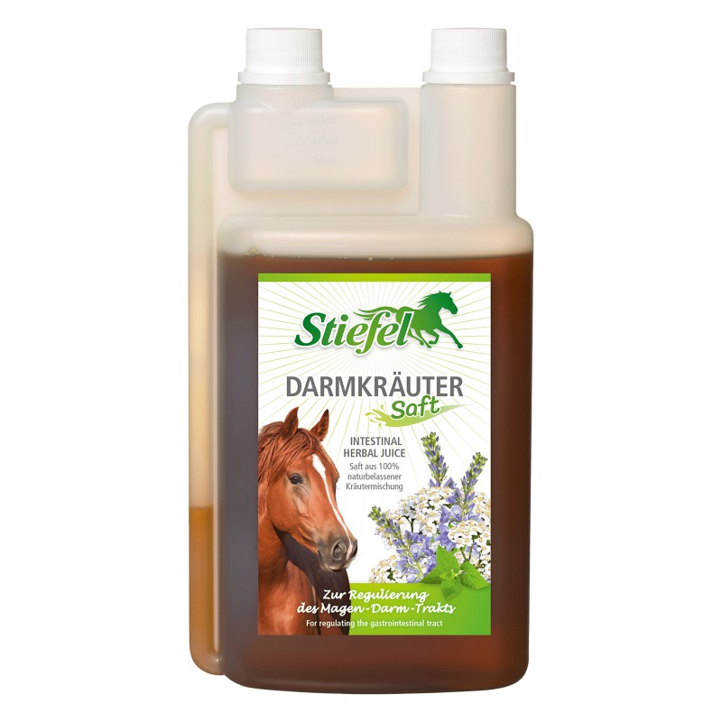 Aanvullend diervoeder voor paarden Stiefel Darmkruidensap is een kruidensap gemaakt uit een natuurlijk kruidenmengsel zonder kunstmatige smaakstoffen en kan helpen het gehele maag-darmkanaal te reguleren. De kruiden kunnen een positief effect hebben op het spijsverteringskanaal en zo een gezonde spijsvertering bevorderen. Stiefel Intestinal Herbal Juice kan zowel permanent als specifiek worden toegediend in fasen van verhoogde belasting van het maag-darmkanaal, b.v. bij het wisselen van stal, het wisselen van voer of bij de start van het weideseizoen. Voedingsadvies: Grote paarden (600 kg KGW) 70 ml/dag Kleine paarden 35 ml/dag De dagelijkse dosis kan in twee porties per dag over de voeders worden verdeeld. Voerduur: minimaal 14 dagen. Voor een behandelingskuur wordt voeding gedurende maximaal 6 weken aanbevolen. Antidopinginformatie: 48 uur volgens de Duitse nationale federatie (vanaf 07.07.21) Samenstelling: kruidenmengsel gekookt en gefilterd, van salie, citroenmelisse, kamille, duizendblad, oregano en anijs Inhoud: 1l